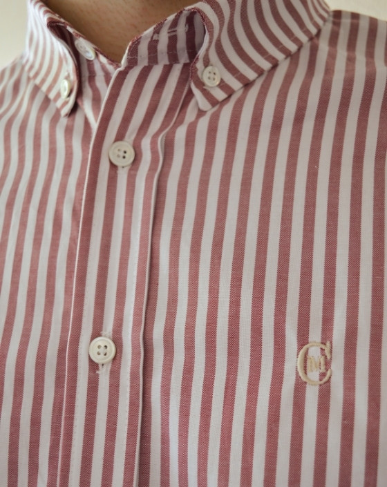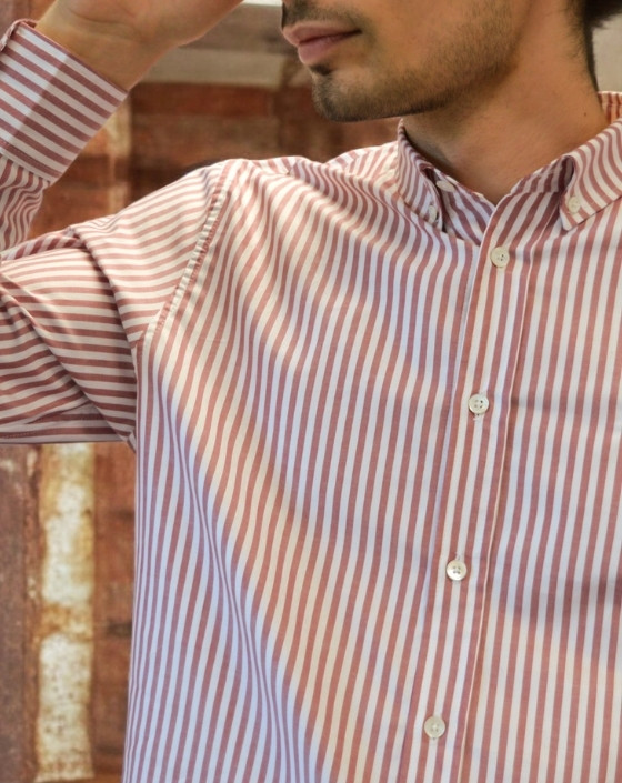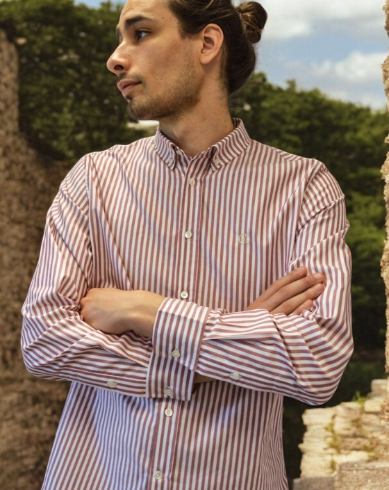 La chemise Vulcain, confectionnée dans notre propre atelier à Toulouse, associe lignes classiques et finitions exigeantes. Son tissu en coton rayé rouge pâle est issu d’un stock dormant. Col américain boutonné, boutons en nacre fabriqués en France : une pièce pensée pour durer, ancrée dans une fabrication locale.